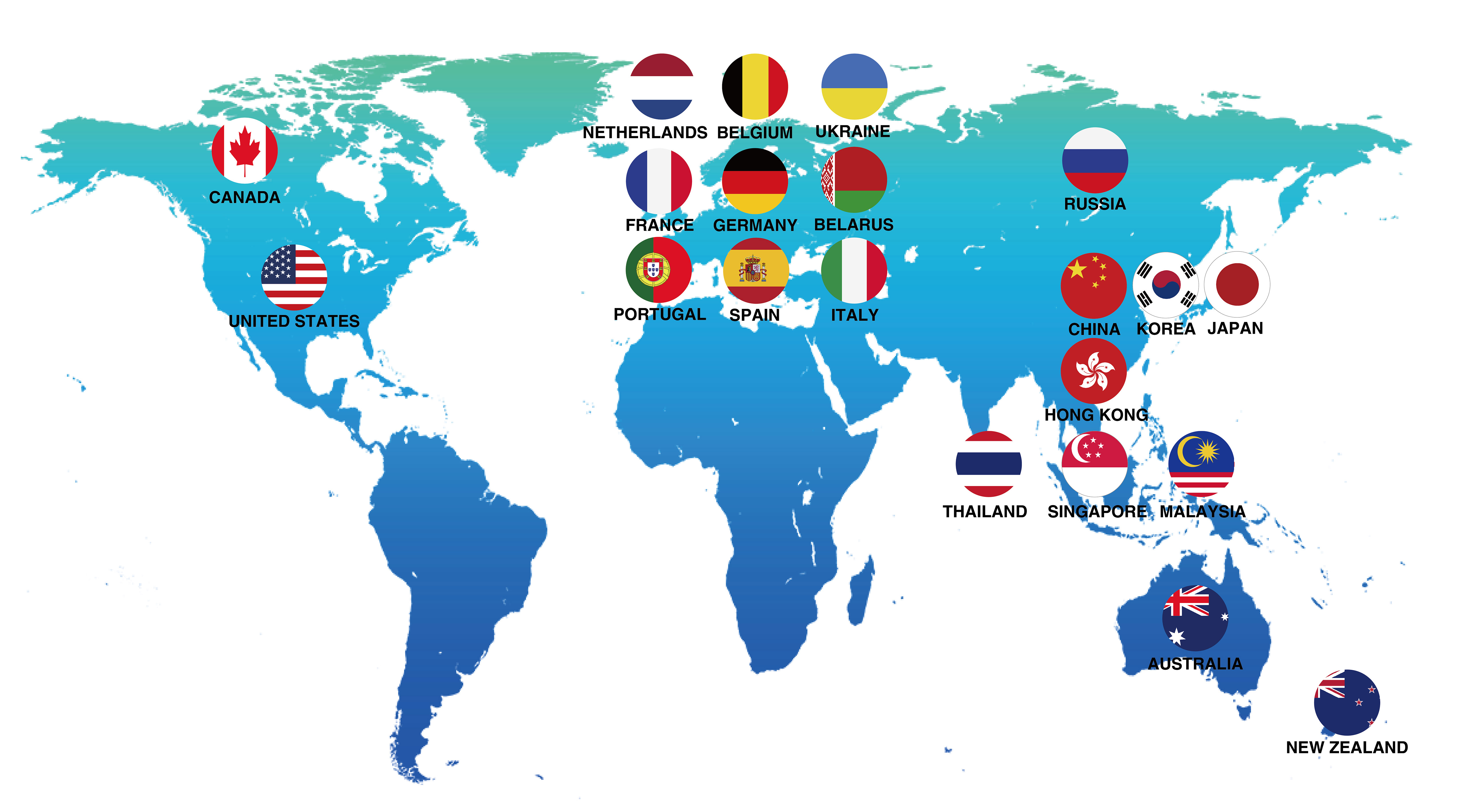 俄羅斯、日本、美國、比利時、泰國、德國、西班牙、英國、法國、加拿大、澳大利亞、新西蘭、馬來西亞、荷蘭、意大利、墨西哥、烏克蘭、新加坡 韓國、菲律賓