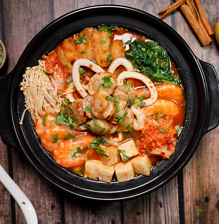 五花肉、辣白菜、年糕、魷魚、蝦夷貝、白蝦、娃娃菜、洋蔥、豆腐、金針菇、香菇、蟹味菇